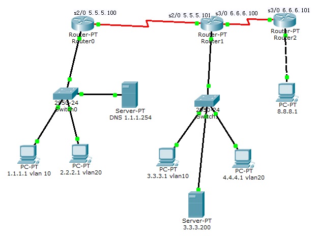 配置原则:添加一个设备设置相关的IP 子网掩码 网关 DNS(需要时),连线(相同设备间用交叉线,不同设备用直连线,服务器与电脑间用交叉线;串口线需要设置频率;),并对每个设备的IP 子网掩码 网关 DNS 接口进行标识;每增加一个设备都要测试是否ping通;然后再增加其他设备