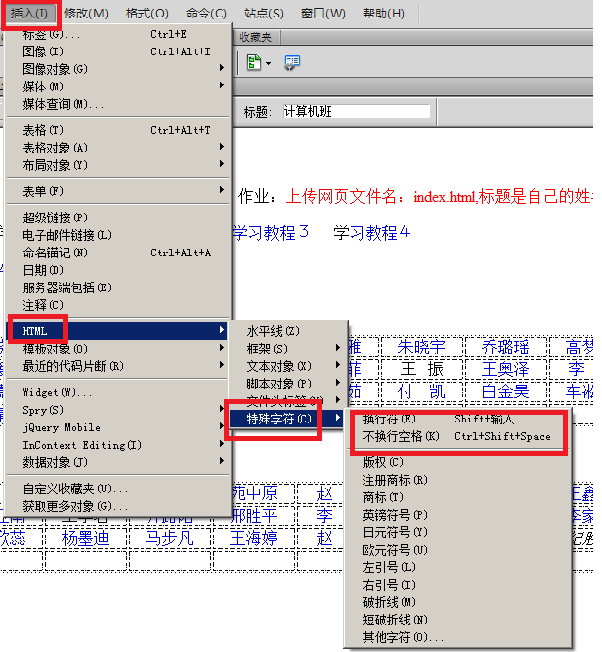 插入空格: 1.全角插入空格 2.源代码中增加 3.在需要插入空格的位置直接按:ctrl+shift+空格 4.利用菜单: