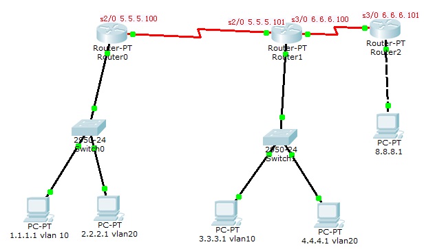 R 2.0.0.0/8 [120/2] via 6.6.6.100, 00:00:21, Serial3/0